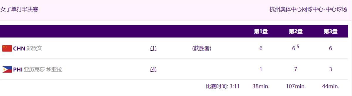 9月28日,亚运会网球女子单打半决赛,中国选手郑钦文以大比分2-1战胜菲律宾选手亚历克莎·埃亚拉,晋级决赛。