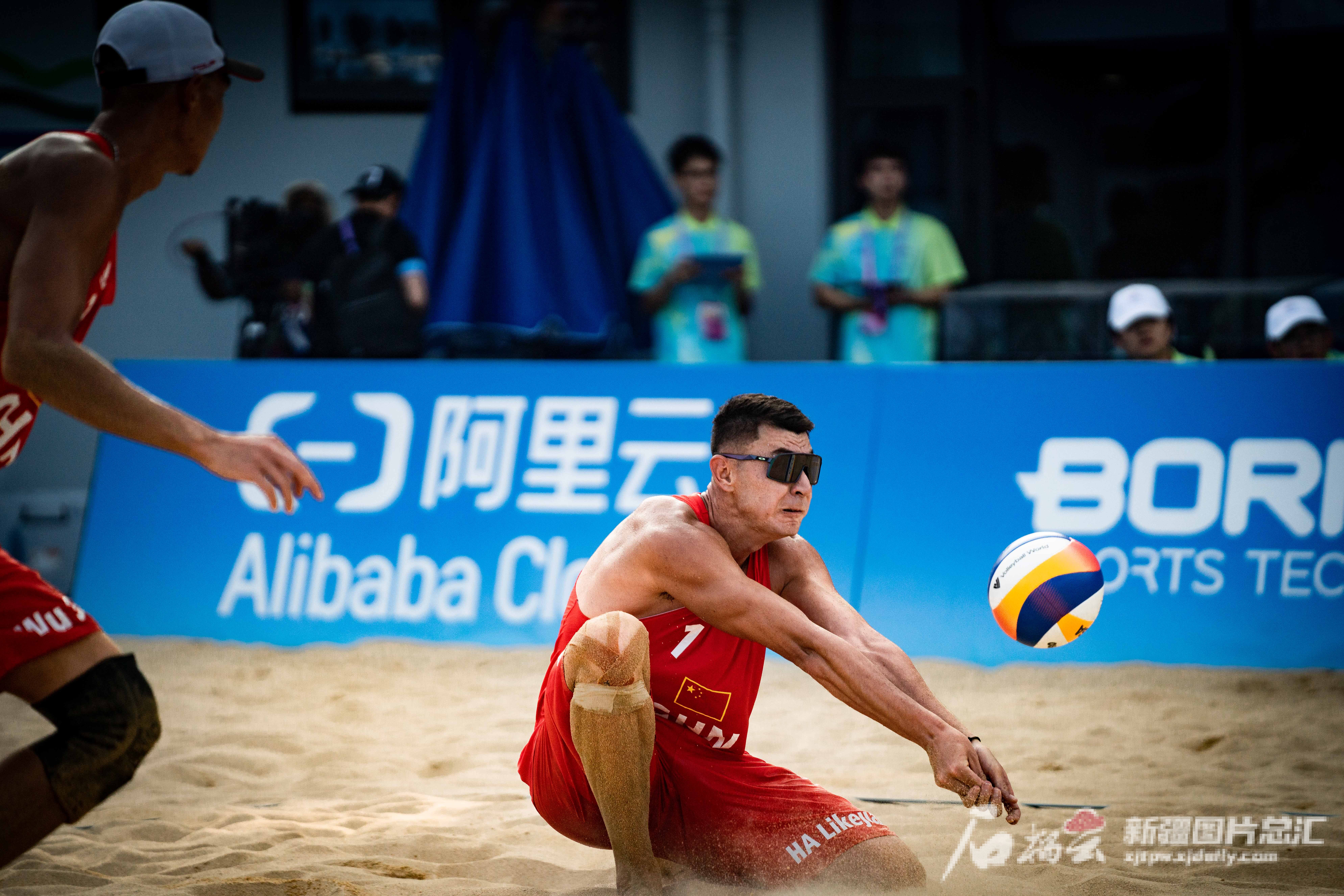 9月28日,杭州亚运会沙排男子组决赛中,中国男子沙排队员阿卜杜哈力克江·穆太力普在比赛中扣杀瞬间。天山网-新疆日报记者吕伊晗摄