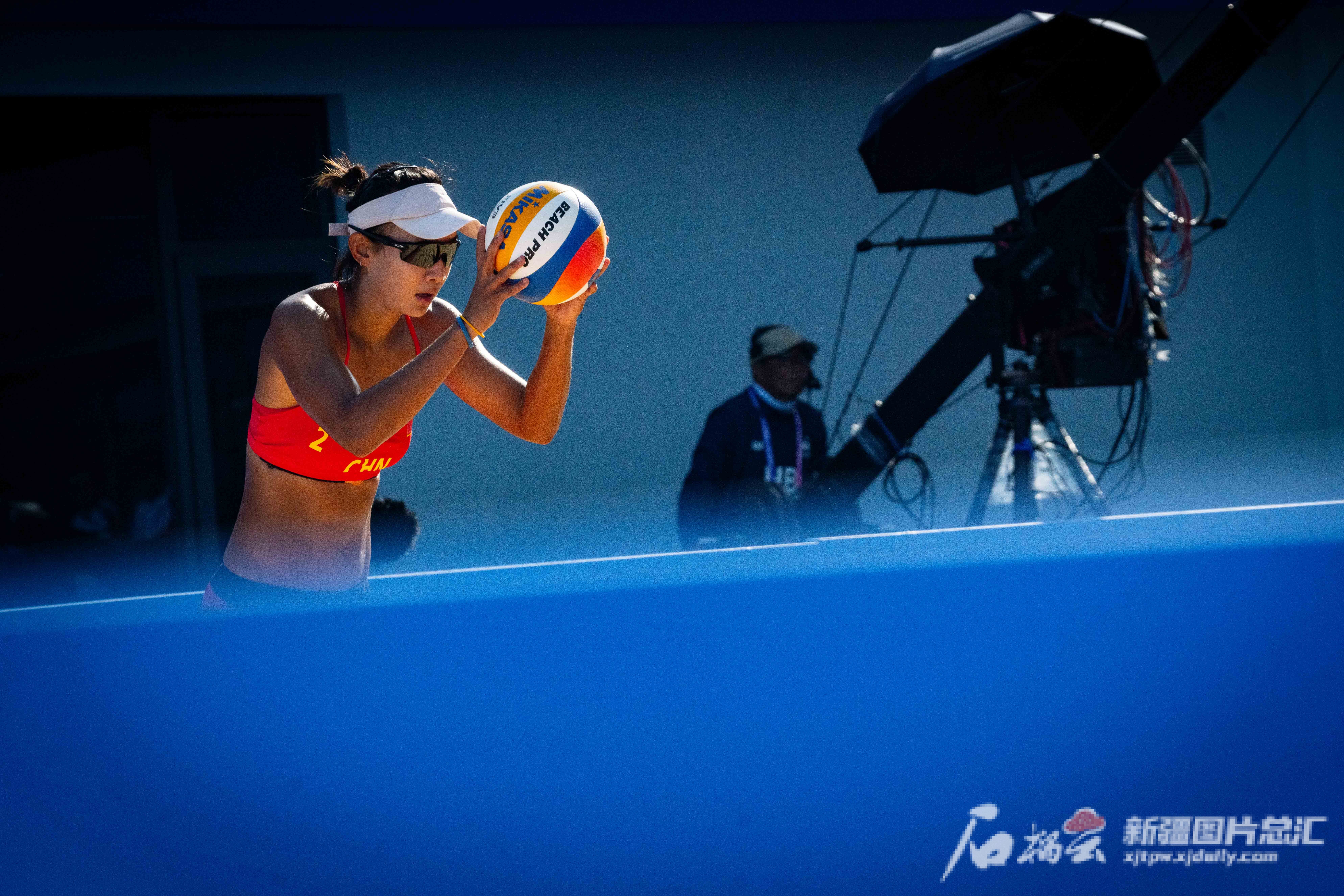 9月27日,杭州亚运会沙排女子组决赛中,中国女子沙排队员夏欣怡正在做发球准备。来自新疆的夏欣怡早已年少成名,如今,三次亚锦赛、三次亚运会,夏欣怡已收获了6个亚洲冠军。天山网-新疆日报记者吕伊晗摄