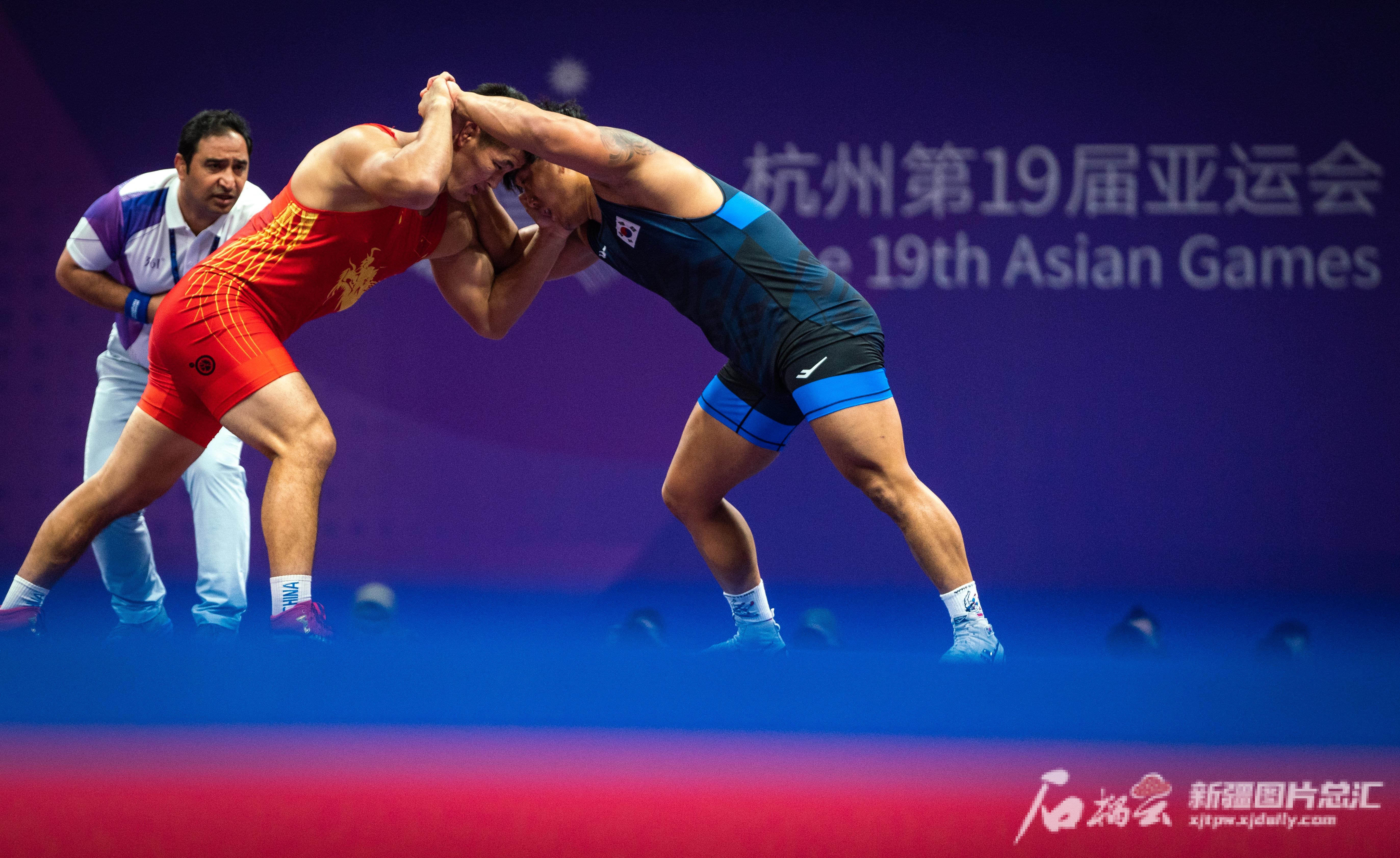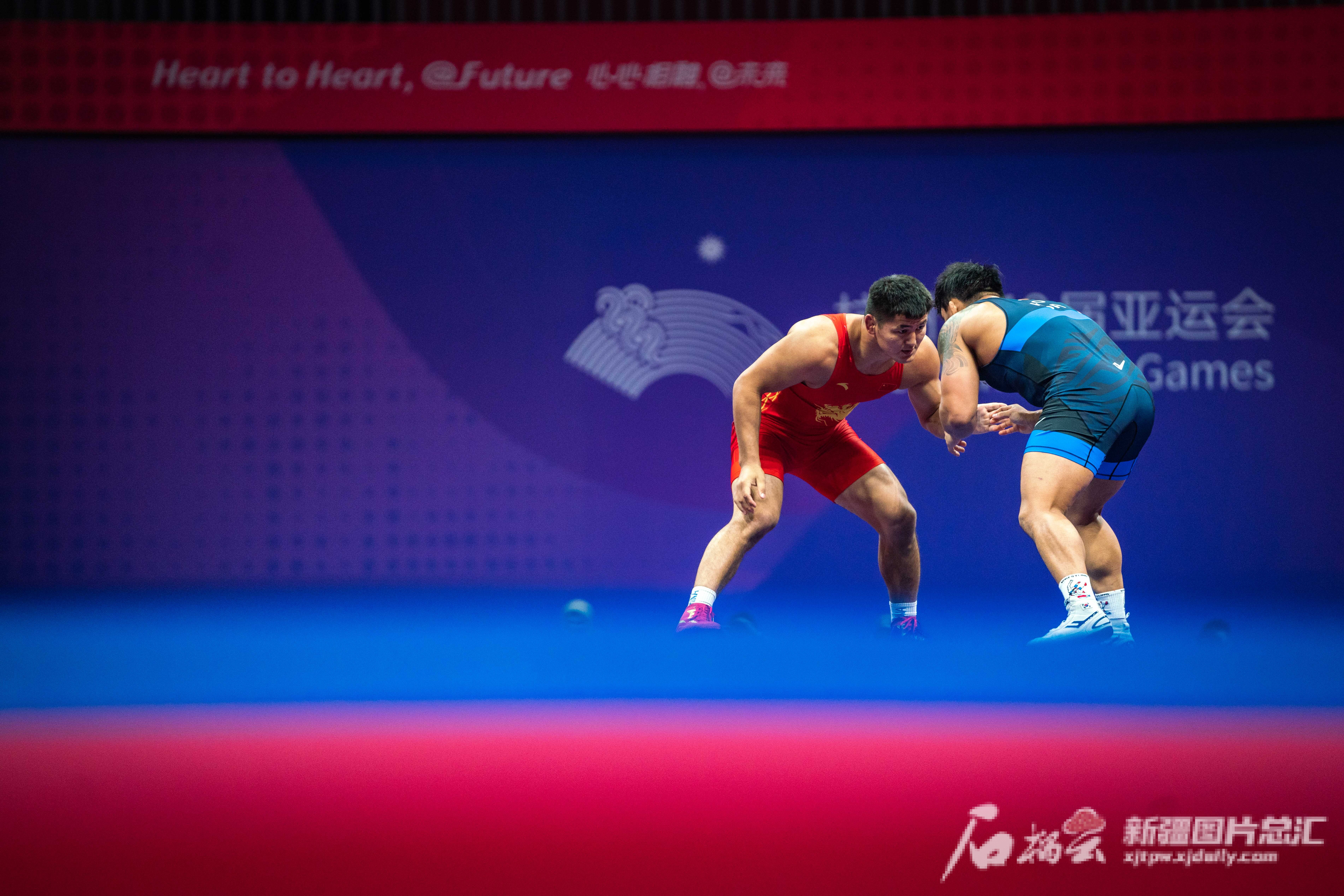 10月7日,杭州亚运会摔跤男子自由式97公斤级铜牌争夺战中,图为中国选手哈比拉·阿吾萨衣满(左)比赛瞬间。天山网-新疆日报记者吕伊晗摄
