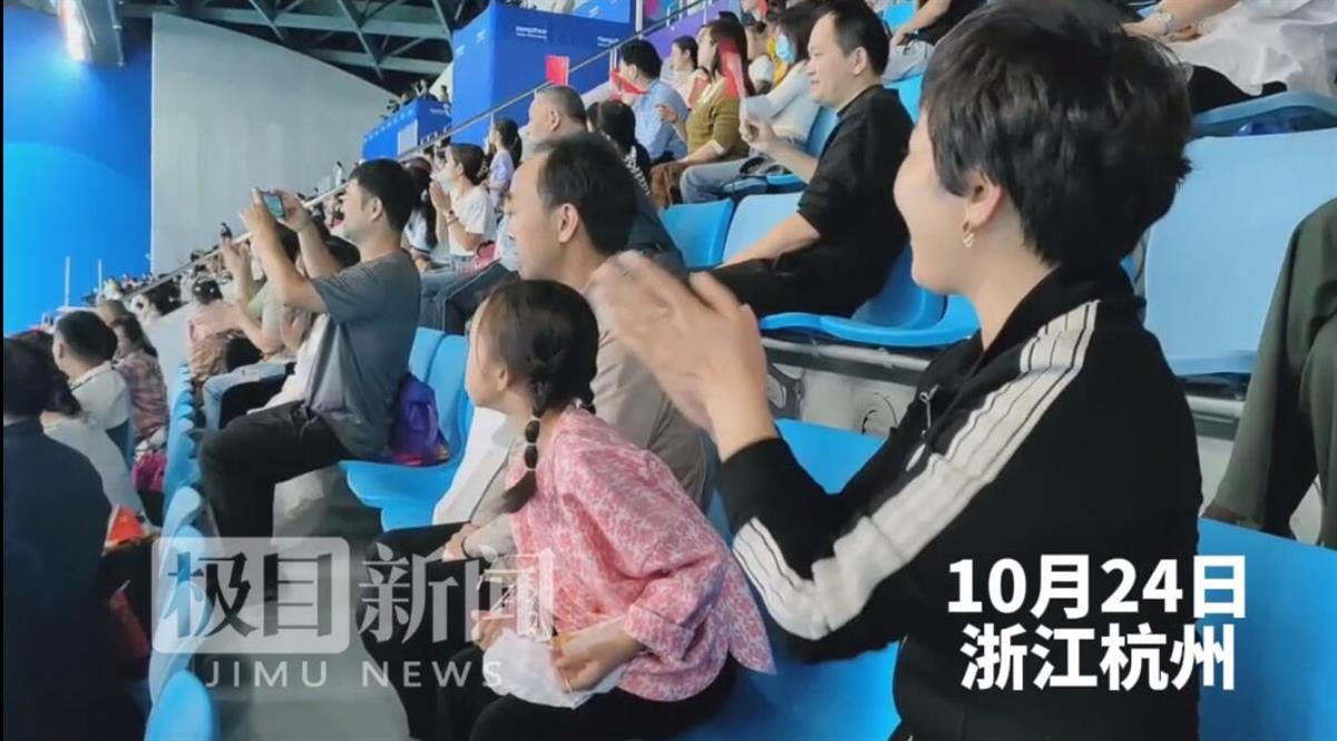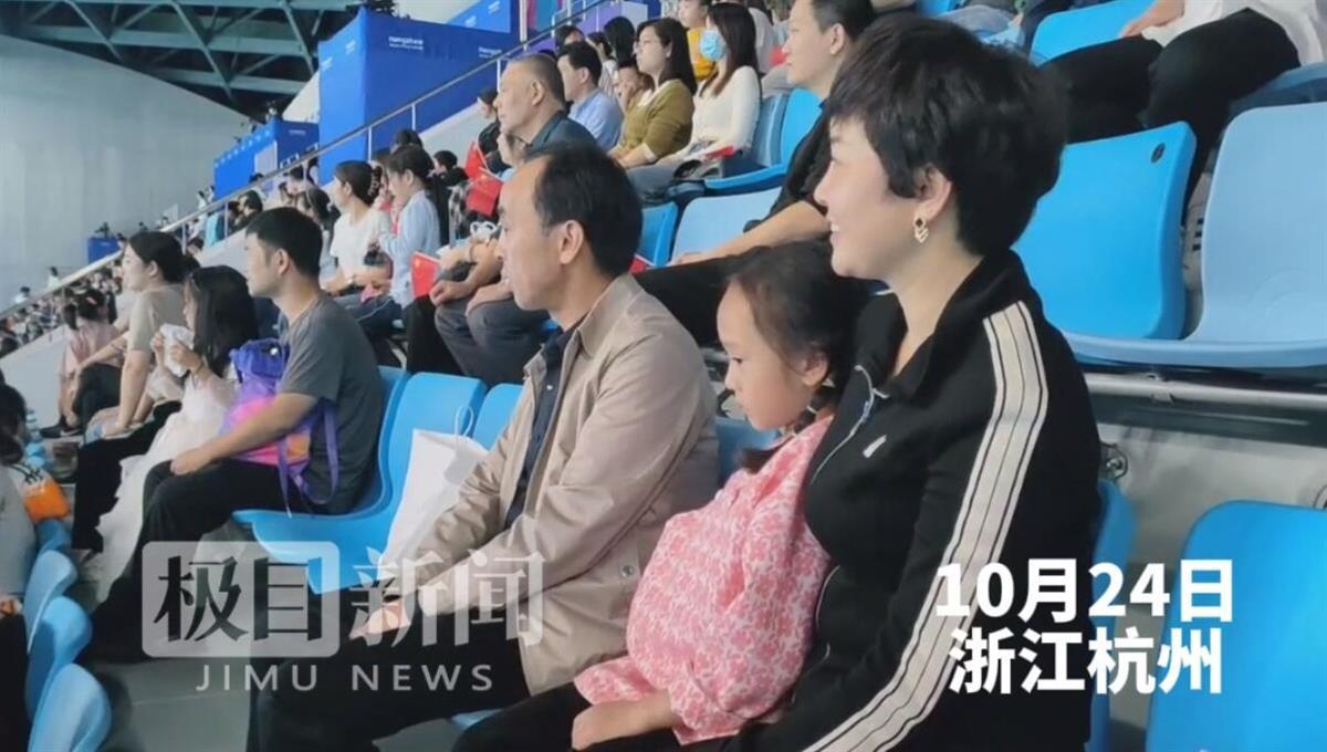 10月24日,在杭州奥体中心游泳馆,湖北选手袁伟译的爸爸、妈妈和妹妹来到现场,为给袁伟译加油助威。