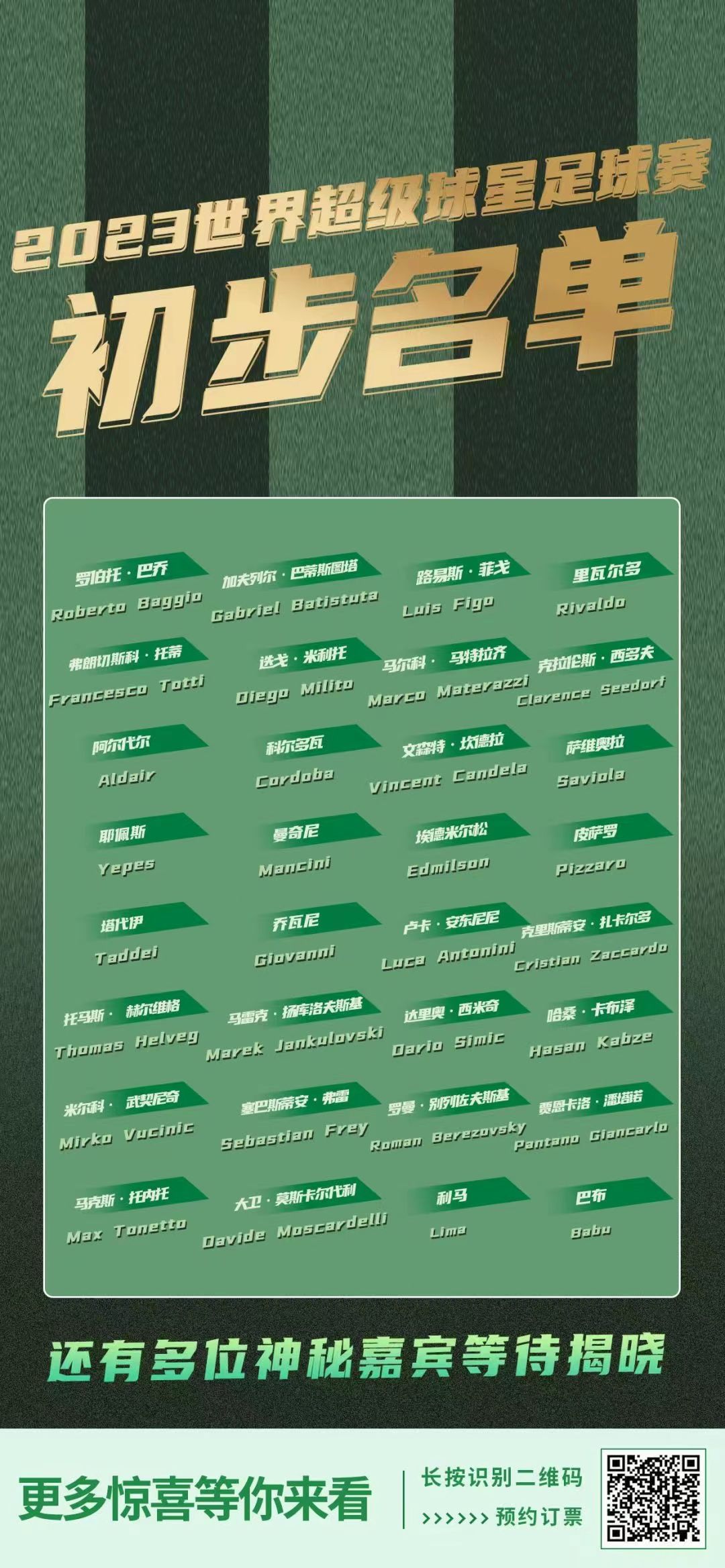 今天发布的阵容有:罗伯托·巴乔、加夫列尔·巴蒂斯图塔、路易斯·菲戈、里瓦尔多、弗朗切斯科·托蒂、迭戈·米利托、马尔科·马特拉齐、克拉伦斯·西多夫、阿尔代尔、科尔多瓦、文森特·坎德拉、萨维奥拉、耶佩斯、曼奇尼、埃德米尔松、皮萨罗、塔代伊、乔瓦尼、卢卡·安东尼尼、克里斯蒂安·扎卡尔多、托马斯·赫尔维格、马雷克·扬库洛夫斯基、达里奥·西米奇、哈桑·卡布泽、米尔科·武契尼奇、塞巴斯蒂安·弗雷、罗曼·别列佐夫斯基、贾恩卡洛·潘塔诺、马克斯·托内托、大卫·莫斯卡尔代利、利马、巴布共32位球星,近期还有神秘球星陆续揭晓!已经发布的阵容,横跨1998、2002、2006年三届世界杯冠军队,有三位足球先生、三位金球奖,六位“10号球衣”,在国内实属稀有。