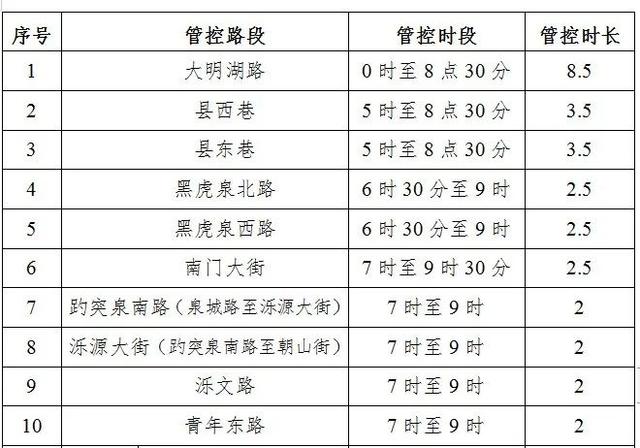 管制范围包括:大明湖路、县西巷、县东巷、黑虎泉北路、黑虎泉西路、南门大街、趵突泉南路(泉城路至泺源大街)、泺源大街(趵突泉南路至南门大街)、泺文路、青年东路、经十路(舜耕路至凤凰路)、凤凰路(经十路至旅游路)、旅游路(凤凰路至市委党校)、虎山路(市委党校至蟠龙路)、奥体西路(经十路至龙奥北路)、龙奥北路(奥体西路至龙奥东路)、港兴一路(旅游路至港源六路)。