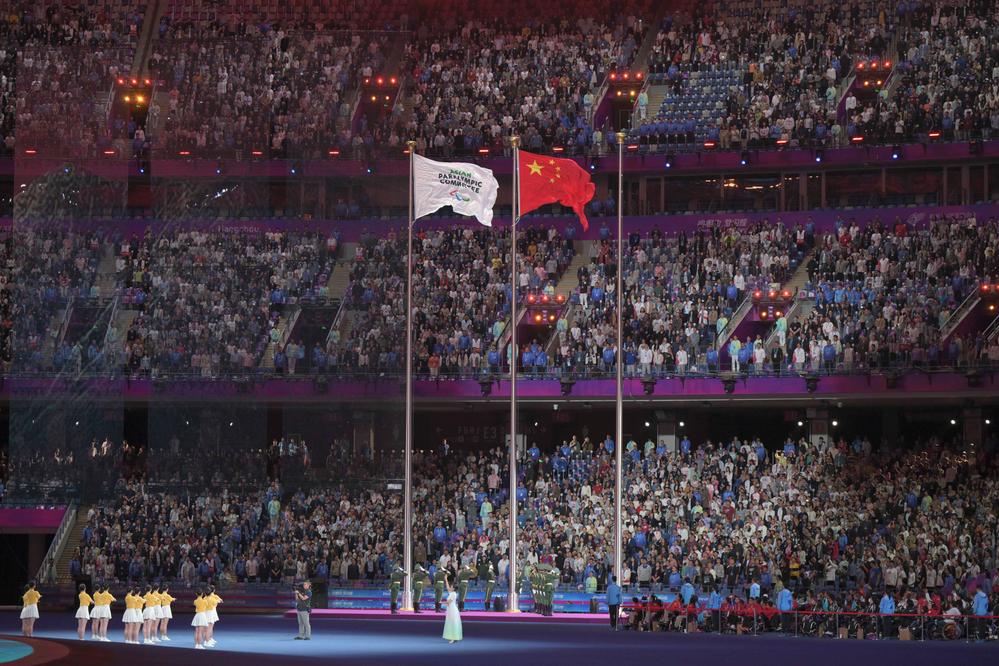 亚残奥委员会会旗和中华人民共和国国旗在闭幕式上升起。新华社记者 才扬 摄