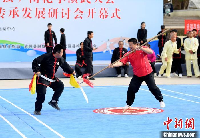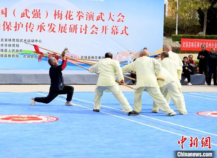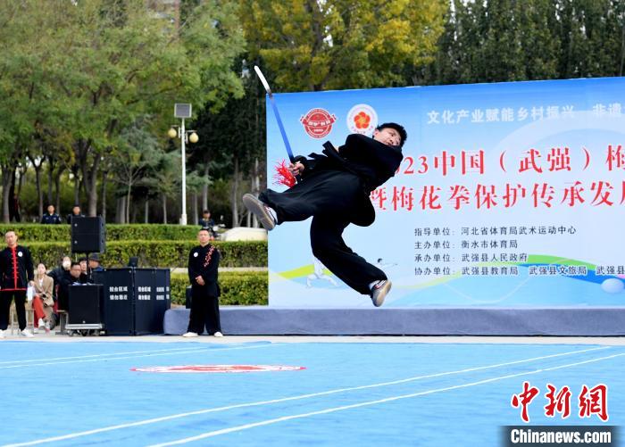 拉架子、器械表演……3日,由河北省衡水市武强县举办的2023中国(武强)梅花拳演武大会上,来自北京、上海、山东等地的400余名梅花拳弟子齐聚一堂,切磋技艺。