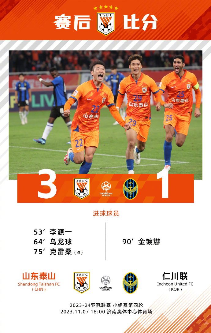 第75分钟,泰山队外援克雷桑罚入李海龙制造的点球,帮助泰山队三球领先。补时阶段,仁川联队打入挽回颜面的一球。