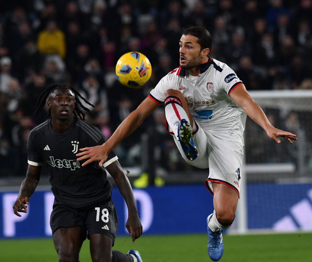 11月11日,尤文图斯队球员弗拉霍维奇(右)与卡利亚里队球员多塞纳拼抢。新华社发(费德里科·塔尔迪托摄)