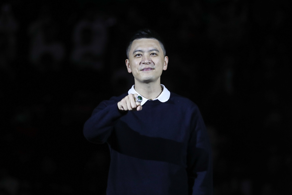 11月15日,前辽宁本钢队主教练杨鸣在赛前领取冠军戒指。 新华社记者 潘昱龙 摄