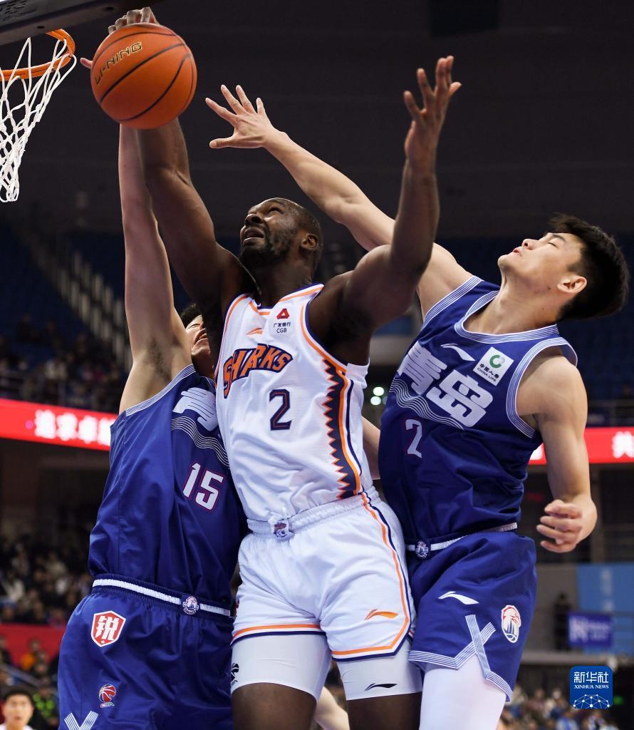 11月15日,上海久事队球员冯莱(中)在比赛中上篮受阻。新华社记者李紫恒摄