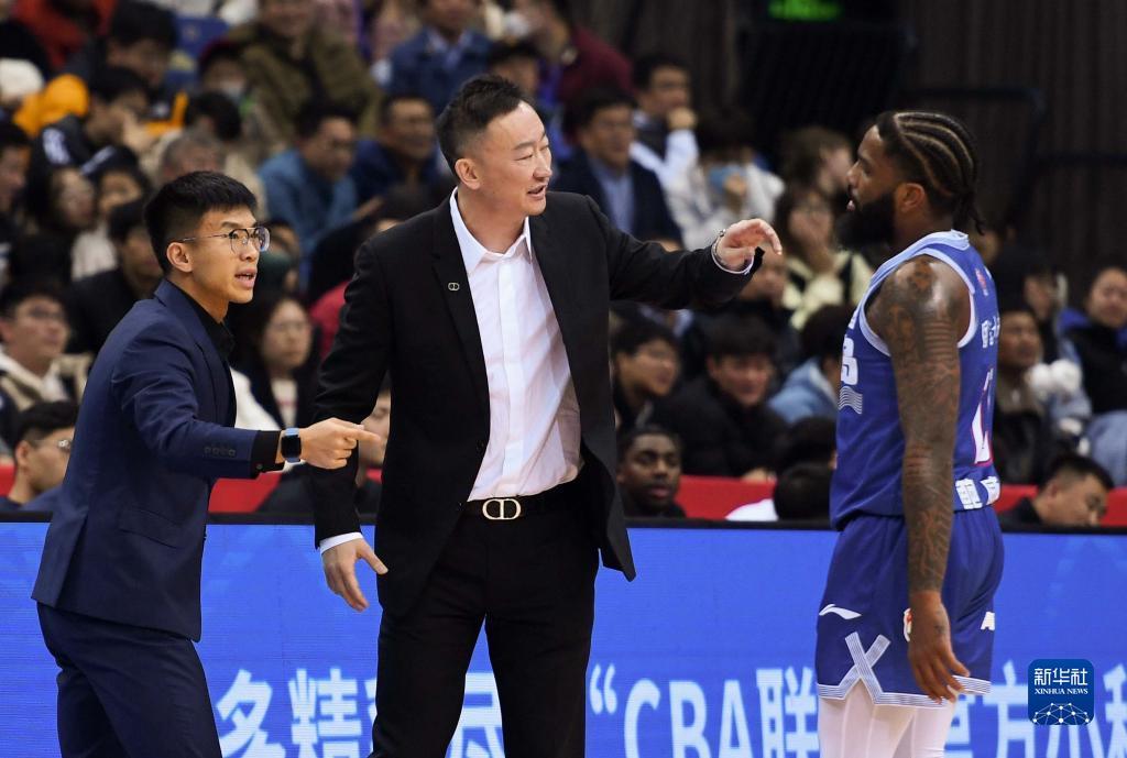 11月15日,青岛国信水产队主教练刘维伟(中)在比赛中指导球员鲍威尔。新华社记者李紫恒摄