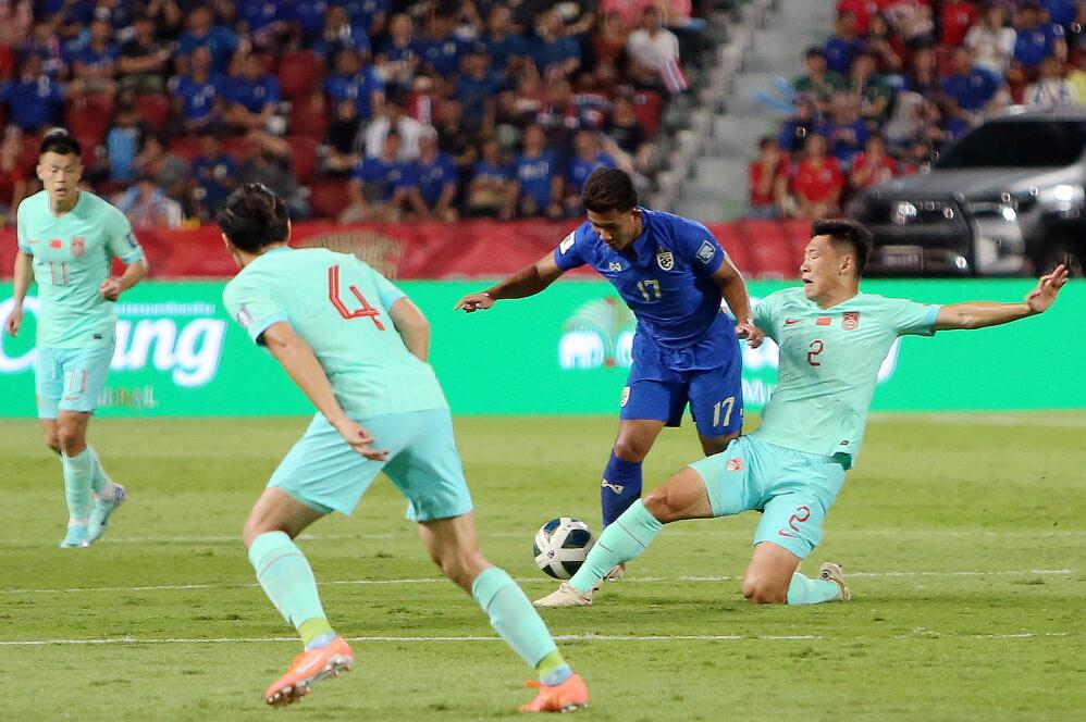 虽然泰国队的世界排名低于中国30多位,但泰国足球近些年的进步有目共睹,再加上中国男足的下滑,两队近些年颇有些势均力敌的意味。反映在这场比赛中,主场作战的泰国队踢得更为凶猛,第23分钟率先攻破了中国队的球门。