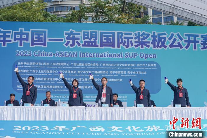 11月19日,2023中国—东盟国际桨板公开赛在广西南宁邕江民生码头水域鸣笛开赛,来自印度尼西亚、菲律宾、泰国、印度等国家和地区的13名外国选手,以及来自中国国内11个省、自治区和直辖市的247名选手共同驰骋于邕江之上,体验着乘风破浪与激情对决的乐趣。