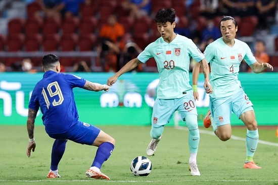 2026美加墨世界杯亚洲区预选赛,泰国队1∶2不敌中国队。图为中国球员韦世豪(右)突破。视觉中国供图