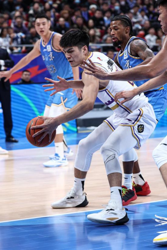 11月6日,效力于山西队的张宁(左)在2023-2024赛季CBA常规赛的比赛中。张宁毕业于北京大学,曾代表北大男篮多次获得中国大学生篮球联赛冠军。新华社记者雒圆摄