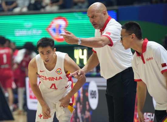 8月30日,中国队主教练乔尔杰维奇(中)2023年篮球世界杯B组小组赛中指导球员赵继伟(左)。新华社记者孟永民摄