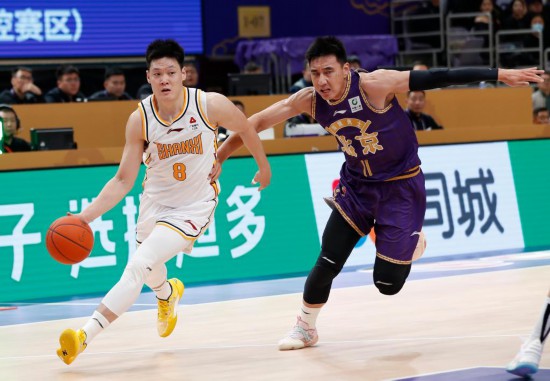 2022年3月1日,效力于新疆队的曾令旭(右)在当年的CBA比赛中带球突破。新华社记者卢汉欣摄