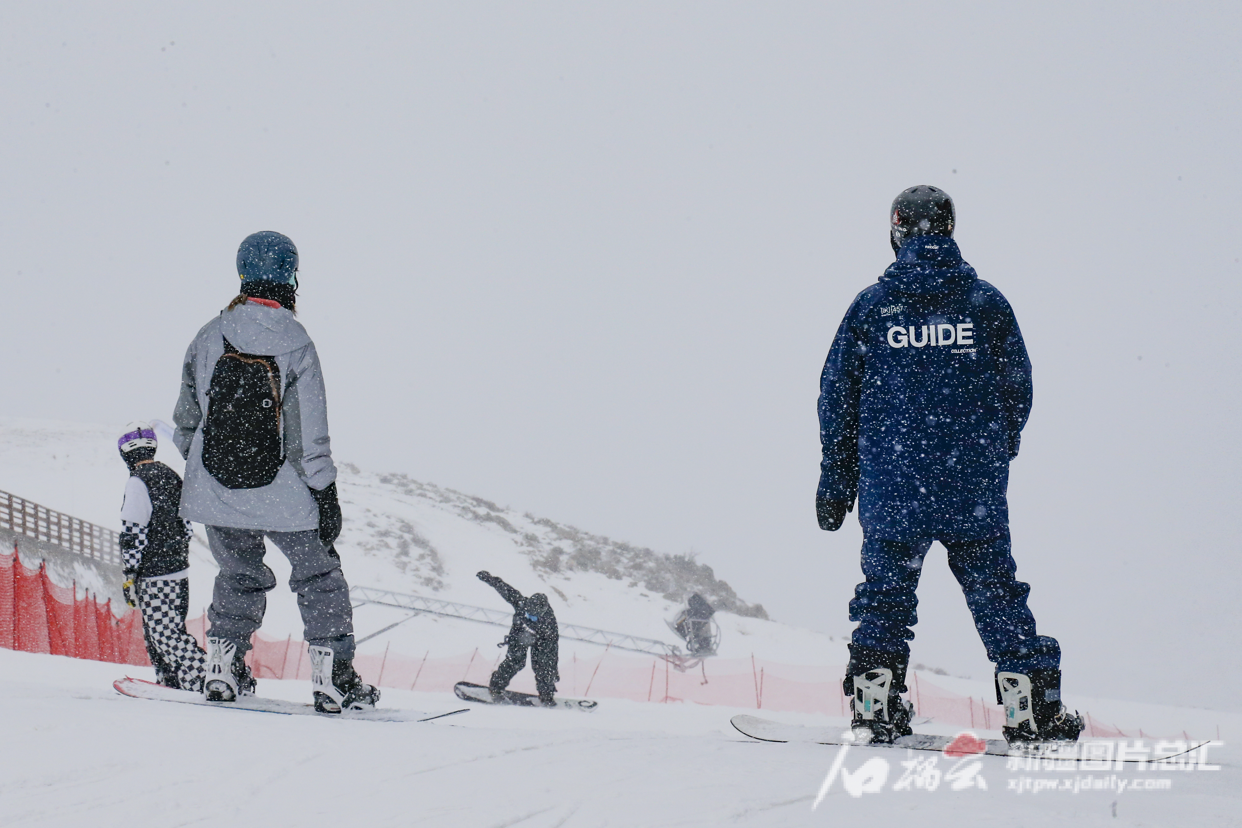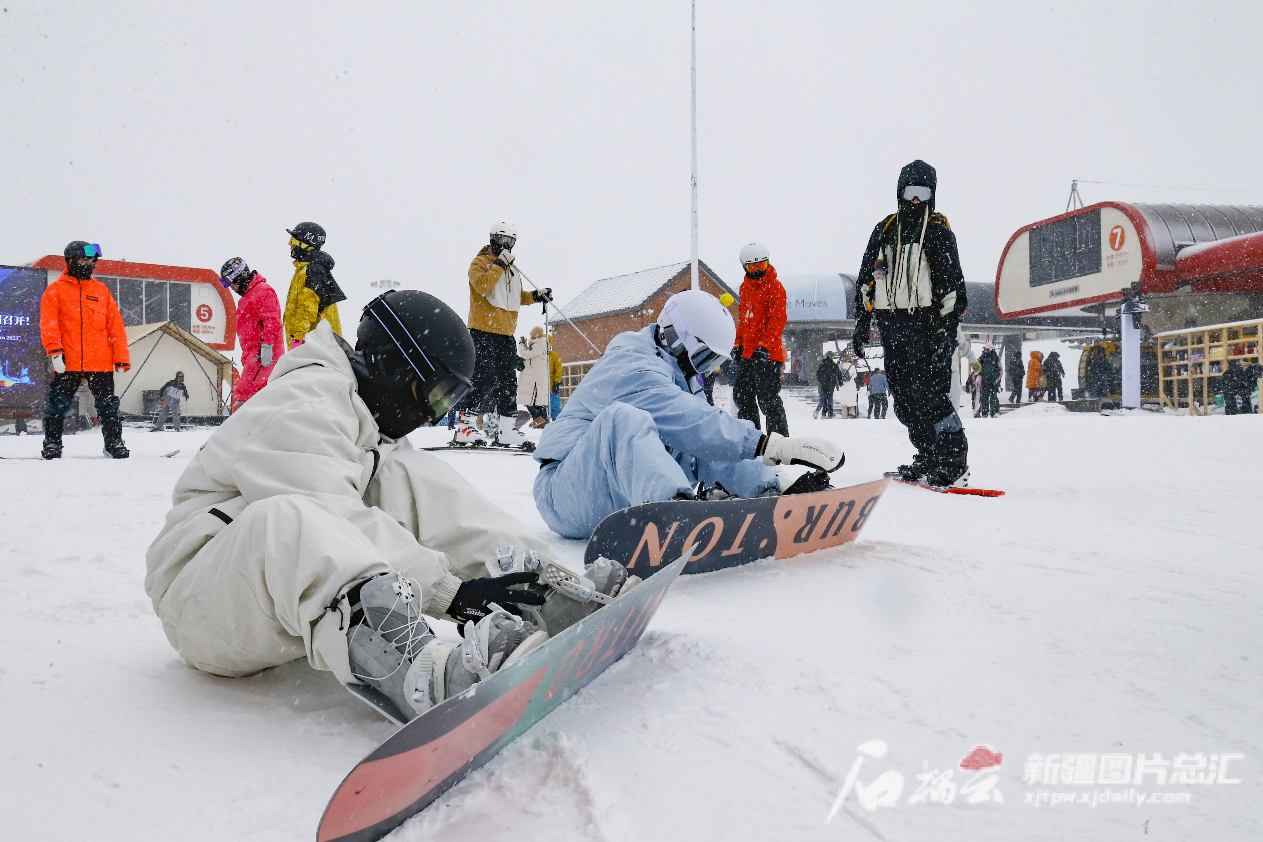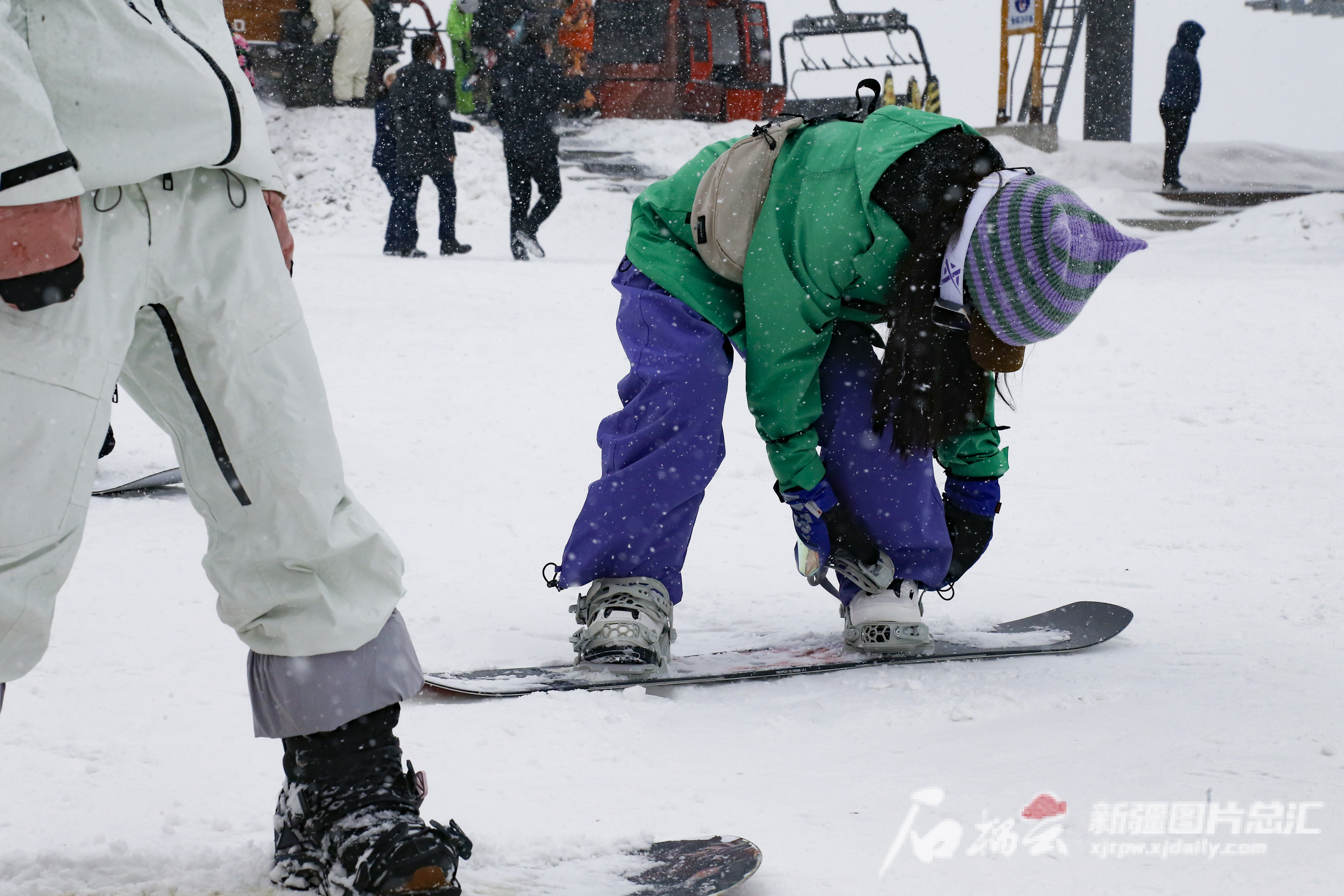 11月25日,在阿勒泰将军山国际滑雪度假区,滑雪爱好者在雪道起点穿雪具。