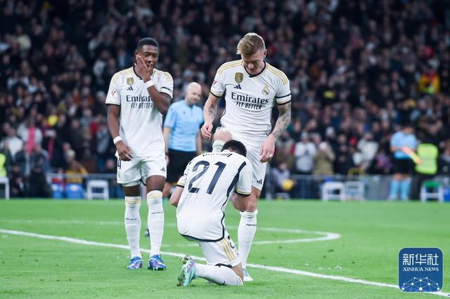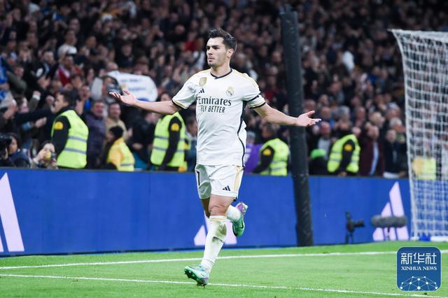 ↑皇家马德里队球员卜拉欣·迪亚斯在比赛中庆祝进球。