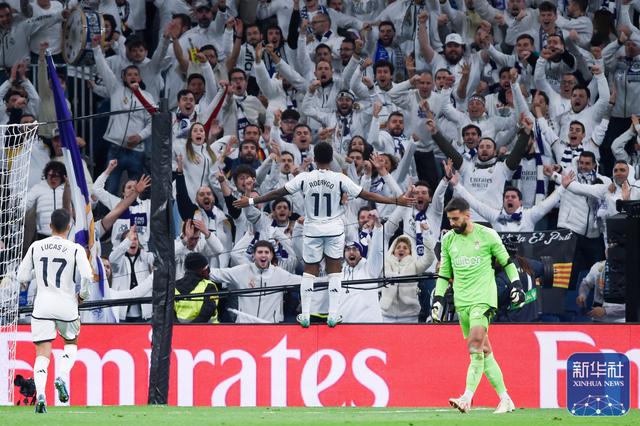 ↑皇家马德里队球员罗德里戈(中)在比赛中庆祝进球。