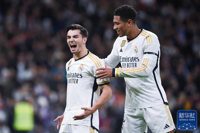 ↑皇家马德里队球员卜拉欣·迪亚斯(左)与贝林厄姆在比赛中庆祝进球。