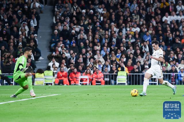 ↑皇家马德里队球员卜拉欣·迪亚斯(右)在比赛中破门得分。