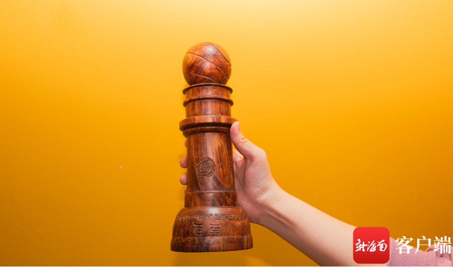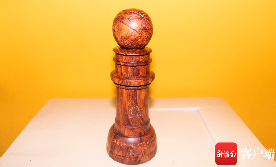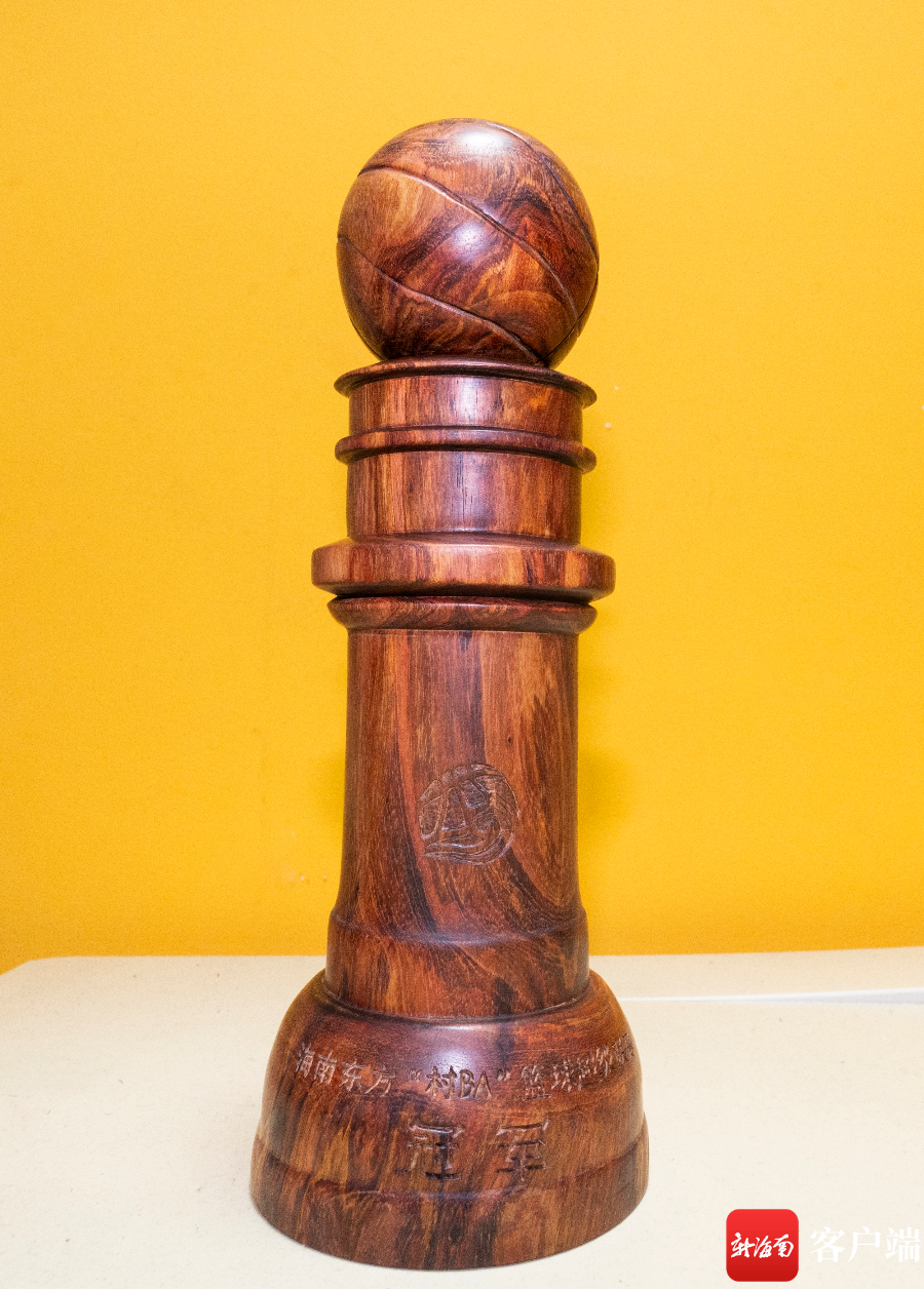 据了解,海南东方“村BA”冠军奖杯——“鱼鳞洲杯”高约25厘米,宽约10厘米,全身取材海南黄花梨并纯手工制作而成。奖杯的设计充分体现了海南东方的地域特色,在设计上选择由篮球、鱼鳞洲、黎族图腾结合而成。
