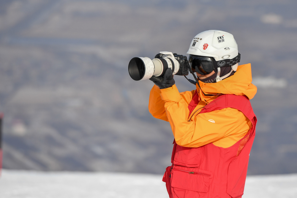 12月7日,在吉林省吉林市万科松花湖度假区,雪场摄影师张健在工作中。新华社记者 张楠 摄