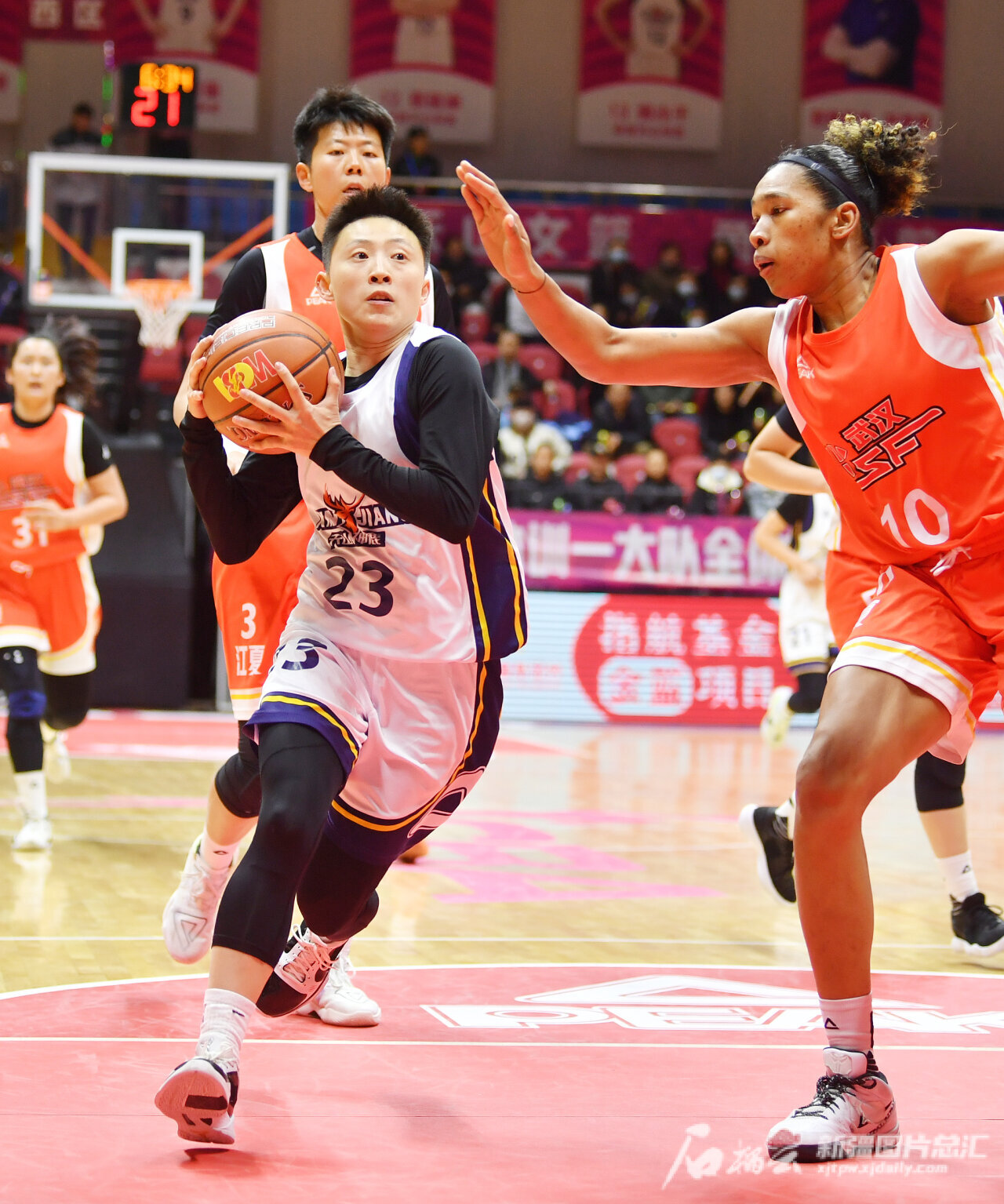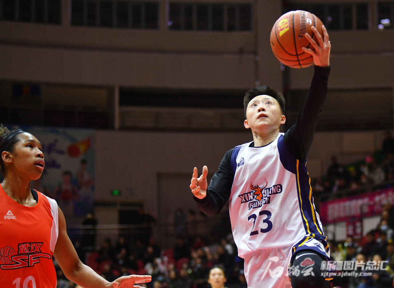 新疆女篮队员彭诗晴持球突破对方外援防守上篮。