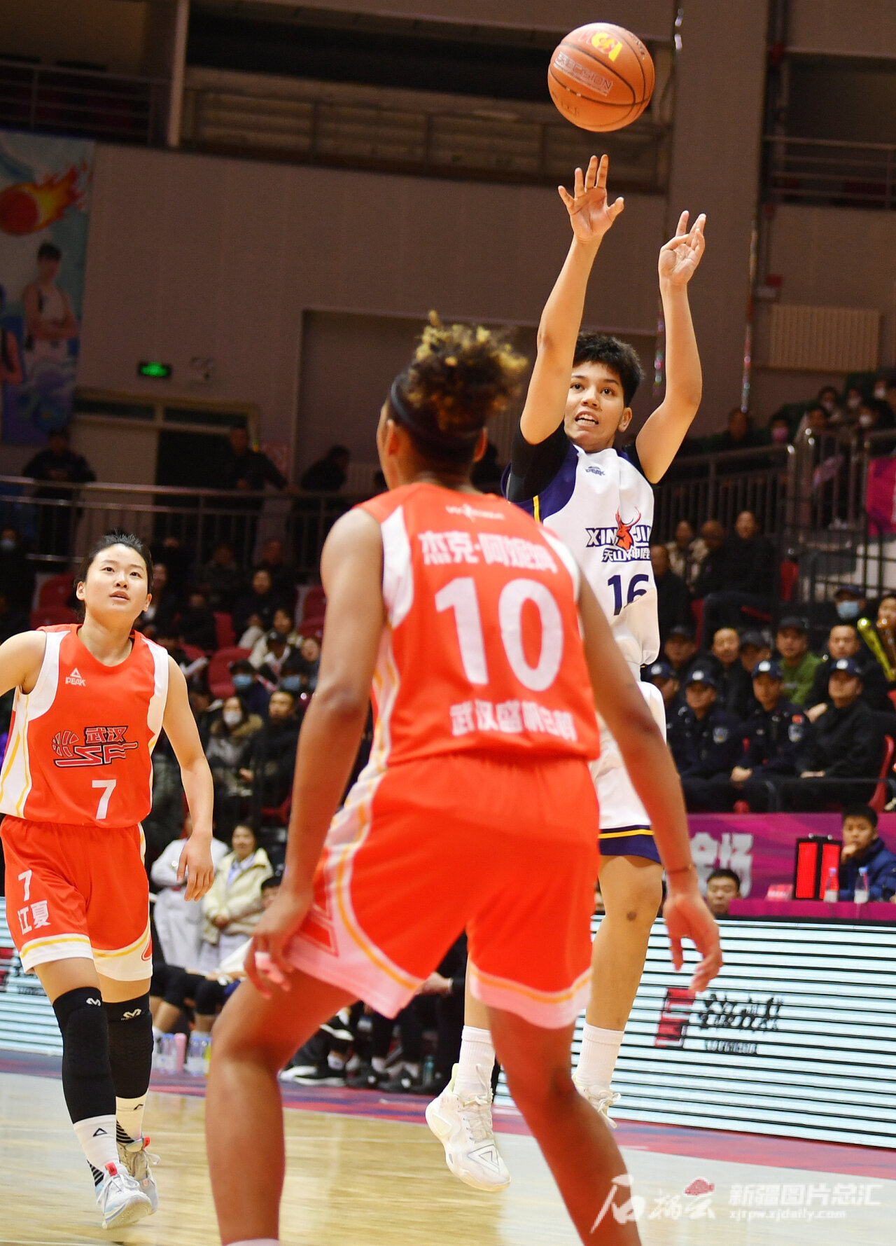 新疆女篮队员热苏拉·阿卜都克力木远投三分。