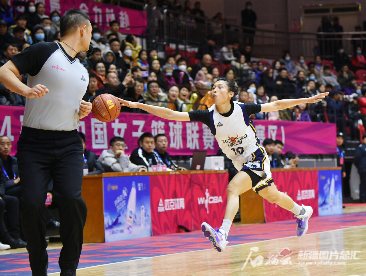 新疆女篮队员吴熠璠拼尽全力救球。