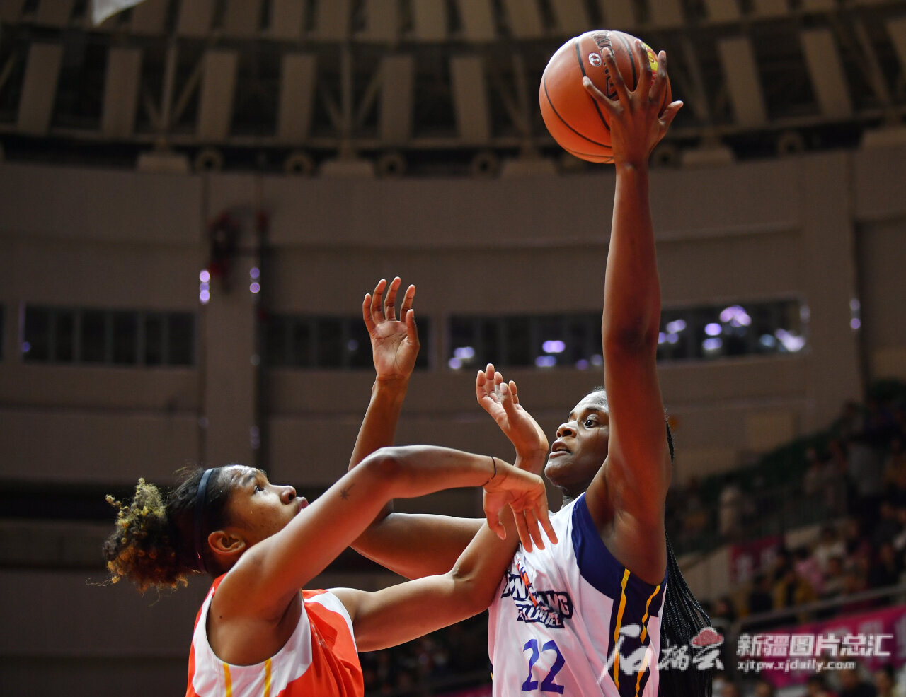 新疆女篮队员卡拉尼·布朗在篮下封盖对方球员的投篮。
