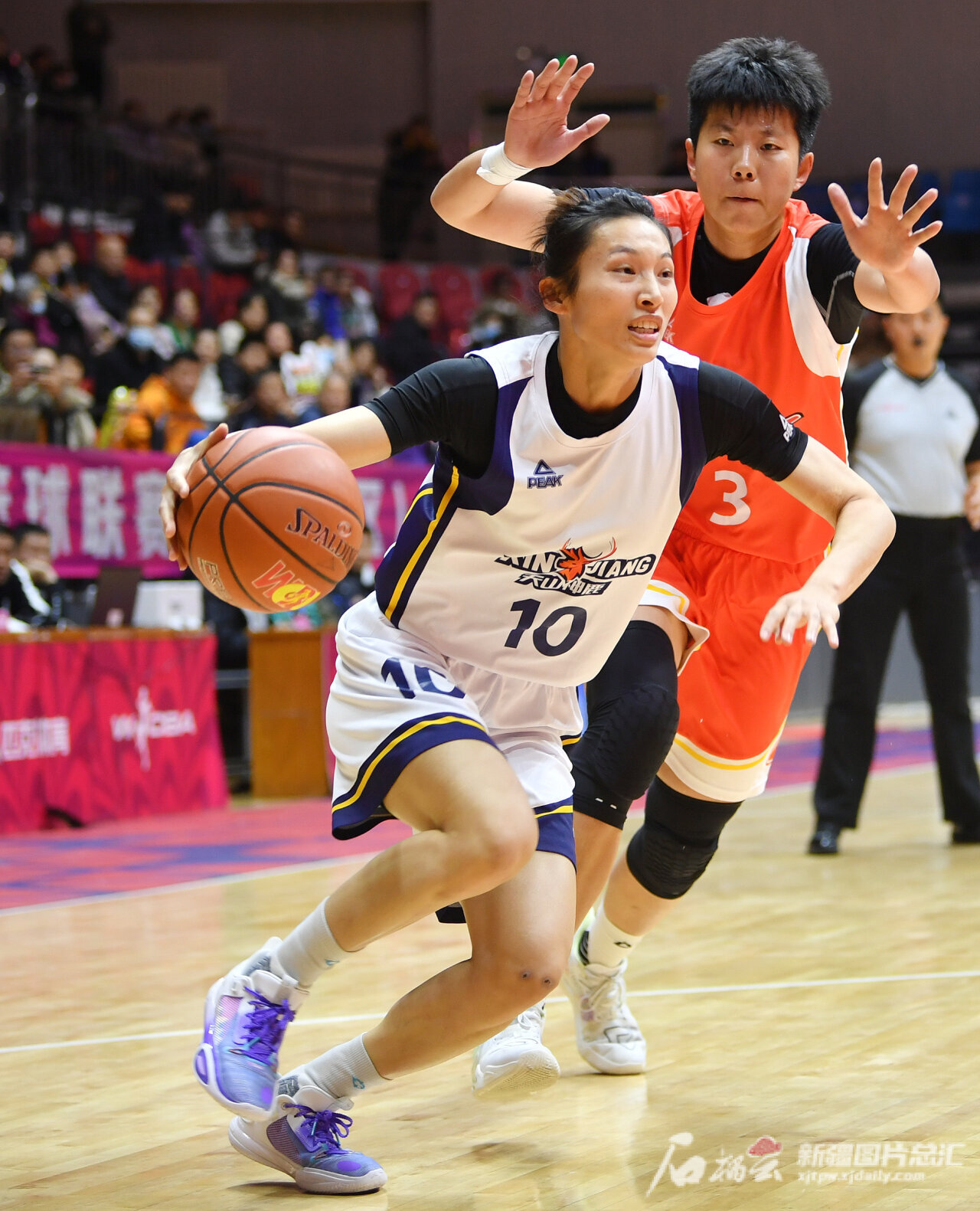 新疆女篮队员吴熠璠持球突破对方防守。