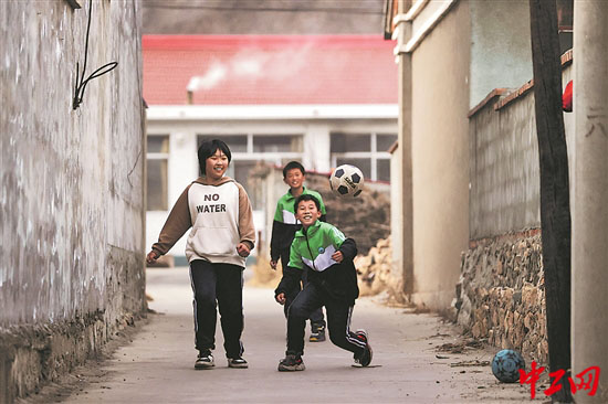 12月7日放学后,几名洒河南小学的学生在黑峪沟村街道踢球玩耍。