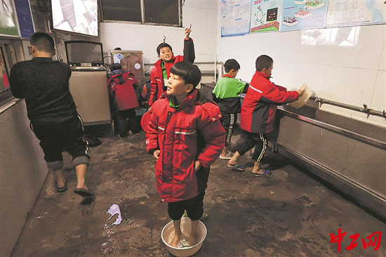 12月7日20时,寄宿的学生们在洗漱。他们中很多人父母都在外地打工,家里距离学校也比较远。