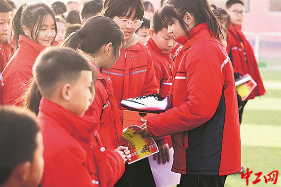 12月6日,在洒河南小学颠球大赛颁奖典礼上,张紫萱领取了特等奖奖品:一双北京国安队捐赠的球鞋。