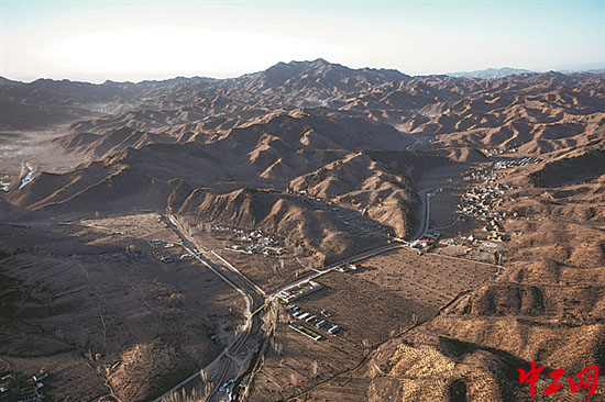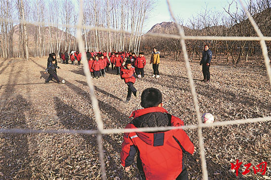 绿茵场中央,学生身穿红色校服,沐浴在冬日暖阳下。两层楼高的校舍和围墙组成了个长方形,把球场围在中间。学校临河而建,河畔是乡村公路。公路与河道绵延伸向远方尽头,连接着散落在山沟沟里各处村庄。