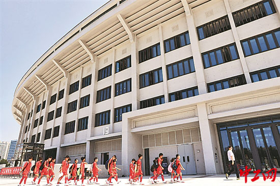 7月16日下午,洒河南小学的足球队员乘坐大巴车来到北京工人体育场参观交流。