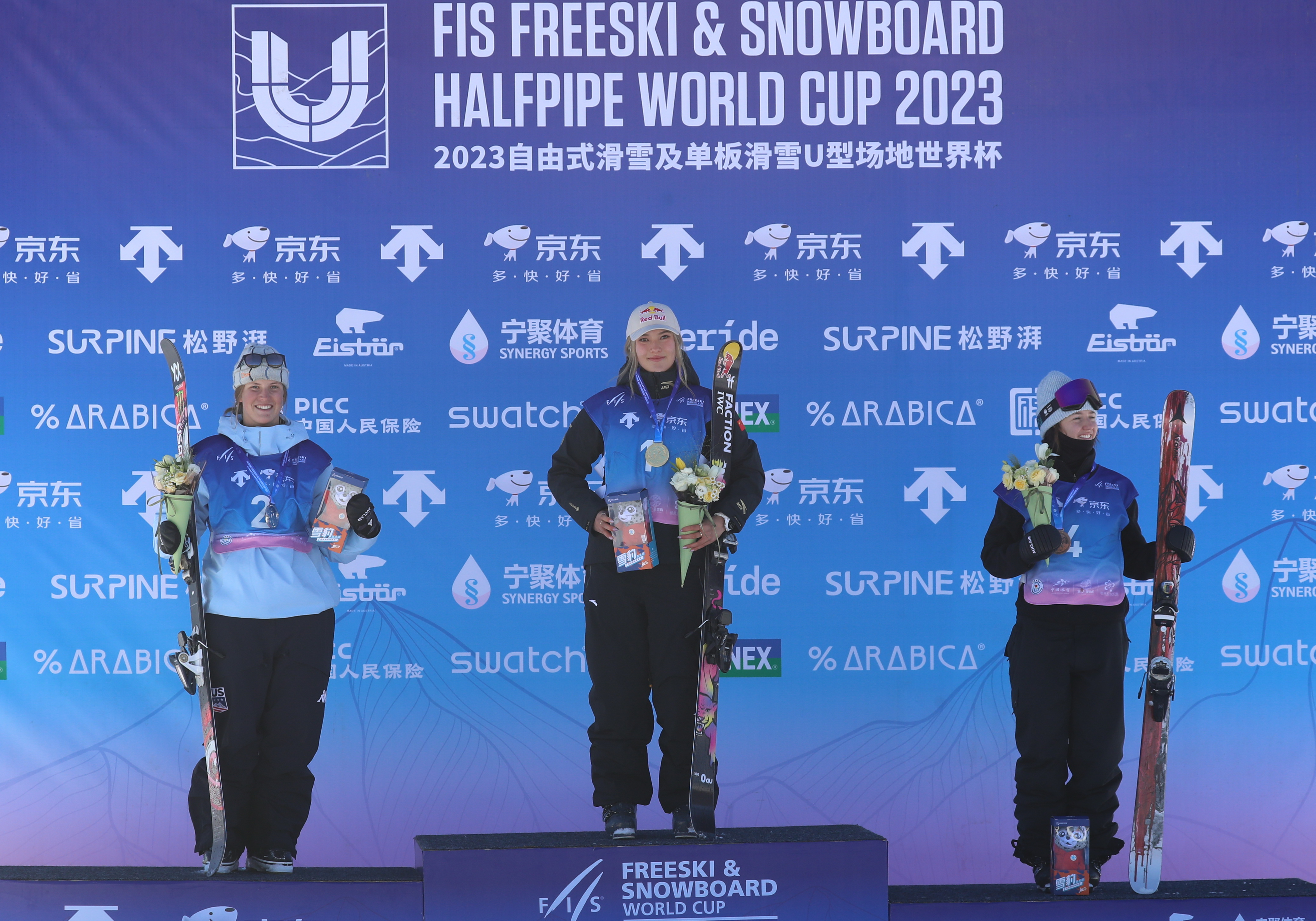 12月9日,冠军中国队选手谷爱凌(中)、亚军美国队选手福尔哈伯(左)和季军加拿大队选手弗雷泽在领奖台上。新华社记者杨世尧摄