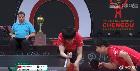 #国乒vs韩国队#【#莎头组合3比0韩国组合#】10日晚,2023年成都国际乒联混合团体世界杯赛迎来了最后的收官之战,国乒迎战韩国队。在第一场混合双打比赛中,@孙颖莎@王楚钦___3比0韩国组合。祝贺!#一人一句给国乒加油#(记者:陈地王曦胥冰洁)