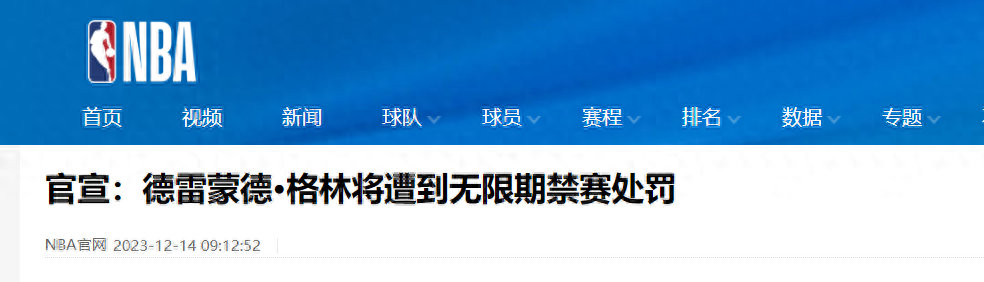 北京时间12月14日,NBA官方宣布,因击打太阳中锋努尔基奇面部,勇士前锋德雷蒙德·格林将受到无限期禁赛的处罚,这一结果考虑到了格林屡次做出的不符合体育道德的行为。