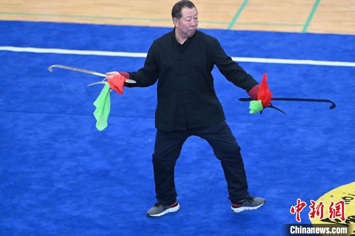 内蒙古呼和浩特市,武术家演练虎头双钩,其前有钩、后有钻、四面有刃,除护手之外皆可使用。 中新网 记者 刘文华 摄
