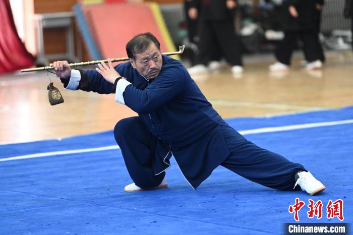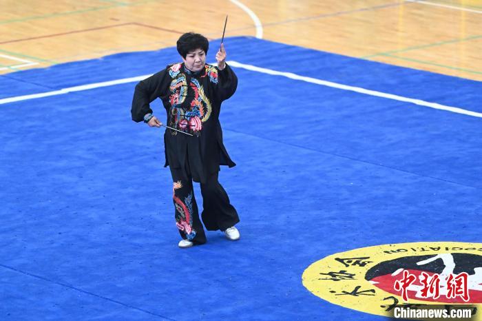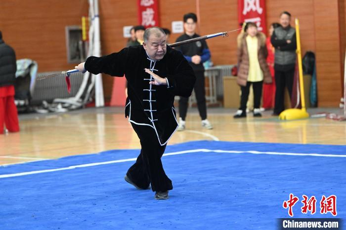 12月27日,内蒙古呼和浩特市,武术爱好者展示武艺。当日,呼和浩特市2023年武术项目展演举办,来自当地各个“武林门派”的武术家、非遗传人、爱好者齐聚,切磋武艺。