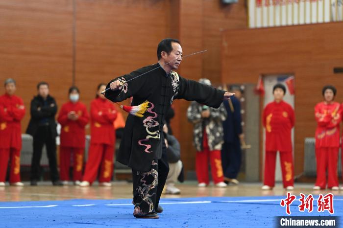 内蒙古呼和浩特市,武术家演练陈氏63势太极剑,具有陈氏太极拳闪转腾挪、松活弹抖、螺旋缠丝、刚柔相济的特点。 中新网 记者 刘文华 摄