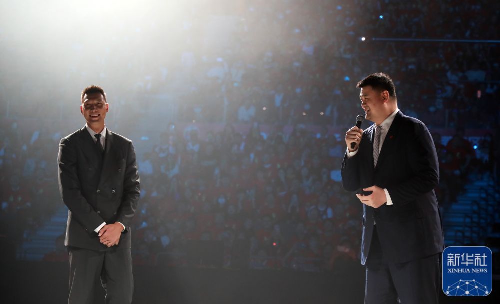 中国篮球协会主席姚明(右)在仪式上讲话。