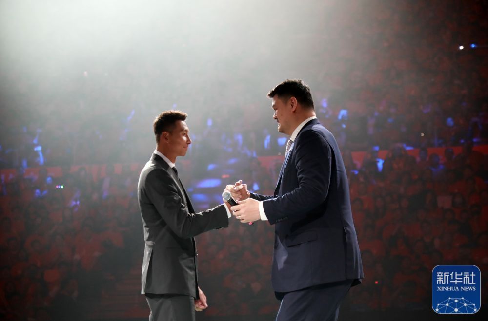 易建联与中国篮球协会主席姚明(右)在仪式上握手致意。