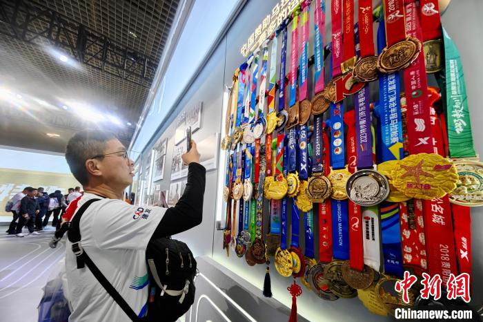 一名马拉松爱好者拍摄各种马拉松赛事奖牌。 中新网记者王东明摄