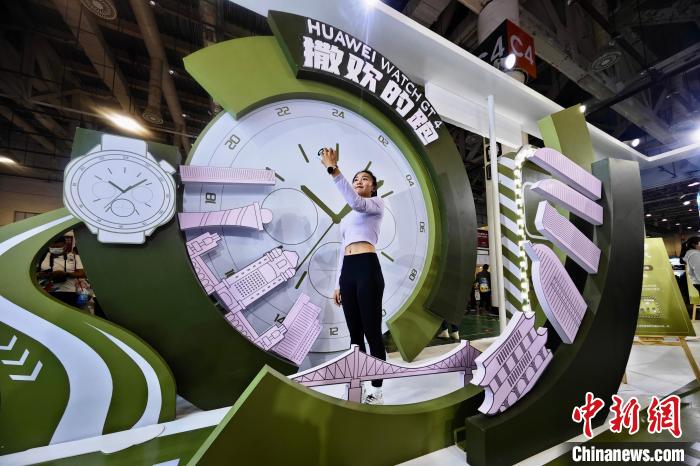 一名马拉松爱好者在展馆里与一款运动手表模型合影。 中新网记者王东明摄