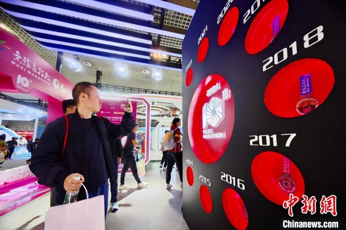 民众观看马拉松相关纪念品。 中新网记者王东明摄