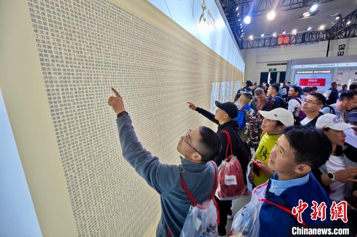 参加2024厦门马拉松的选手正在报名墙上寻找自己的名字。 中新网记者王东明摄