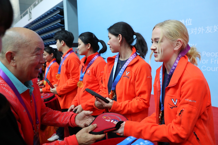 在中美建交45周年之际,北京市对外友协邀请美国弗吉尼亚大学代表团一行18人于1月4日至8日到访北京,并联合市体育局共同举办以“重走乒乓路·一起向未来”为主题的“中美青年乒乓球交流活动”。1月6日,中美球员联合组队进行男女混合双打,两国青年共同合作、携手拼搏的生动场景迎来体育场内阵阵欢呼与掌声。